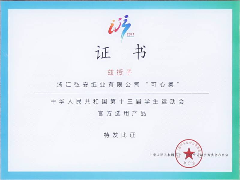 2017年9月4日中华人民共和国第十三届学生运动会在浙江杭州举行,可心柔携手中国邮政、中国平安、娃哈哈、京东校园、吉利汽车等知名企业品牌亮相大会。作为本次大会的12家合作单位之一,浙江B体育·(B-sports)官方网站纸业有限公司参加了发布会,并接受了官方选用产品的授牌。